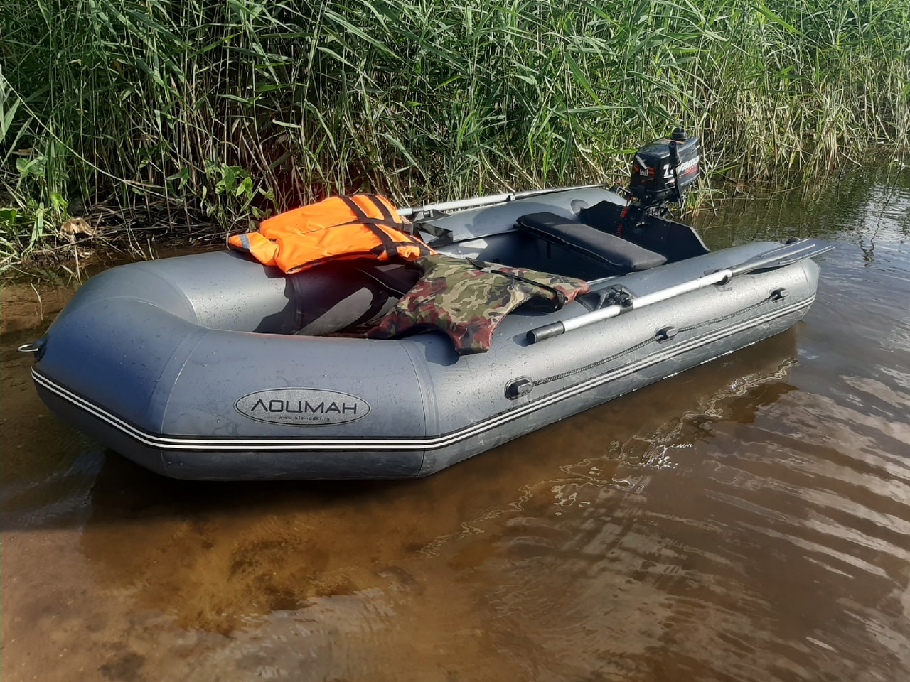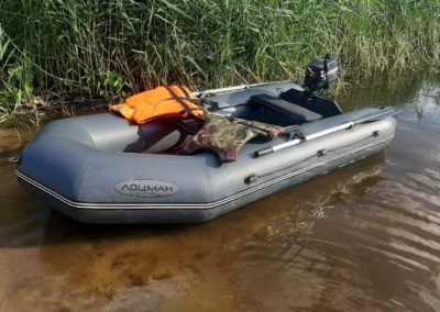 Лодка, насос, весло алюминиевое (сборное) — 2 шт, сидение (сдвижное) — 2 шт, жёсткий пол, сумка, спасательный жилет – 2 шт.